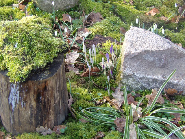 Krokusse und Schneeglöckchen zwischen Findlingen und Moos