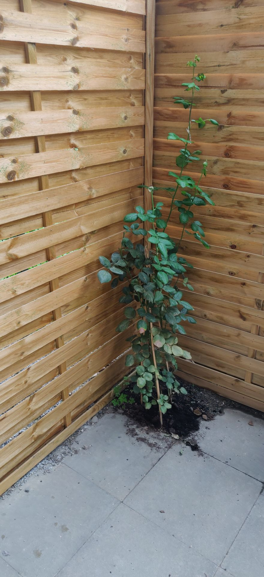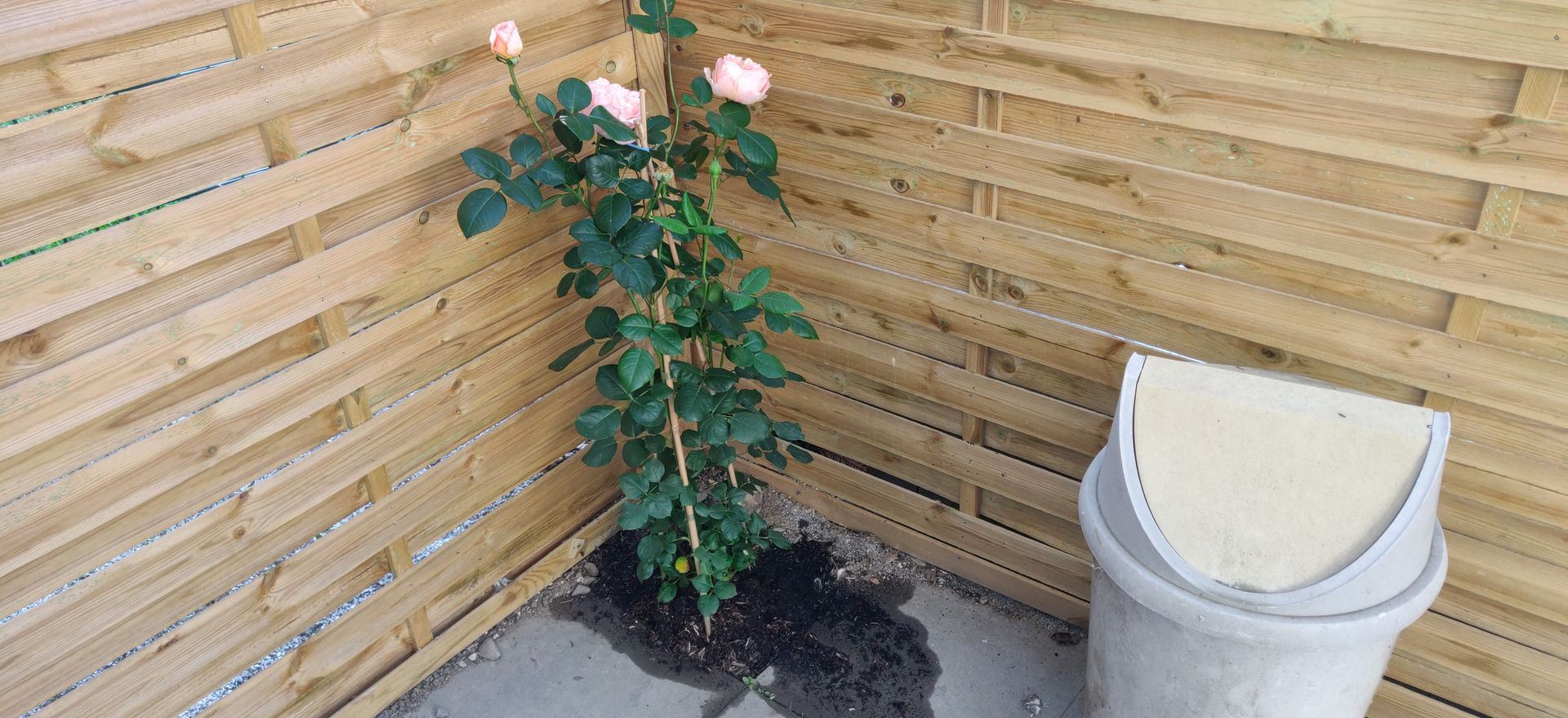Wir haben uns in einem #Gartencenter in Mettmann zwei #Duftrosen für unsere #Terrasse gekauft.Unsere Terasse ist seit September neu gestalltet,unsere Vermieter haben unsere Terrasse mit neuem Sichtschutz ausgestattet und jeweils an den 2 Ecken Stellen gelassen fallswir zB Rosen darin setzen wollen so ihre Aussage.Ich habe darüber mal nachgedacht und zu meinem Mann gesagt das ich gerne 2 Stammrosen setzen möchte.Wir machten uns vorige Woche auf dem Weg und schauen in verschiedenen #Baumärkten rein und begannen bei OBI,Dort fanden wir nicht das gewünschte,entweder waren sie zu verblüht oder zu teuer.Dann als nächster Laden war #Bauhaus drann dort das selbe wie bei OBI.Dann fiel meinem Mann das Gartencenter bei uns in Mettmann ein,wir waren ja schon auf dem Heimweg nach Mettmann,denn OBi und BAUHAUS sind ja in Düsseldorf.Im Gartencenter war bei den Stammrosen leider das selbe,aber ich sah dort eine schöne blühende Duftrosen die kosteten 19,90€ Die anderen Stammrosen kosteten 39-69€ Ich wollte 2 Farben gerne haben einmal in Orange und einmal in Rosa.Ich fand dort nur 2 gute rosanen Duftrosen.Die nahmen wir mit nach Hause.Nun sind sie seit vorgestern eingepflanzt.Das ist die wo eigentlich eine orange Stammrose sein sollte sie ist auf der Seite wo wir sie von der Terrassentür in der Küche sie sehen kann.